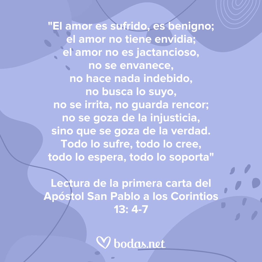 «El amor es paciente, es bondadoso. El amor no es envidioso ni jactancioso ni orgulloso. No se comporta con rudeza, no es egoísta, no se enoja fácilmente, no guarda rencor. El amor no se deleita en la maldad sino que se regocija con la verdad. Todo lo disculpa, todo lo cree, todo lo espera, todo lo soporta. El amor nunca deja de ser